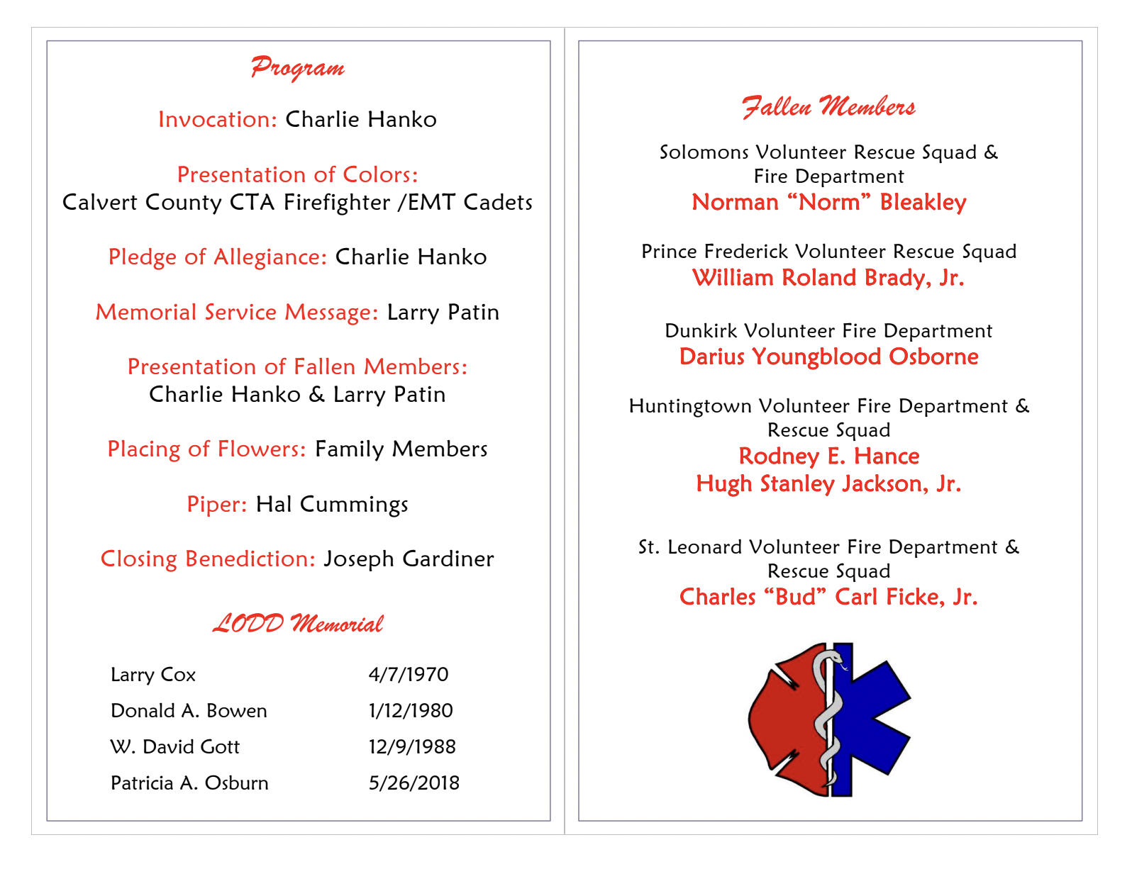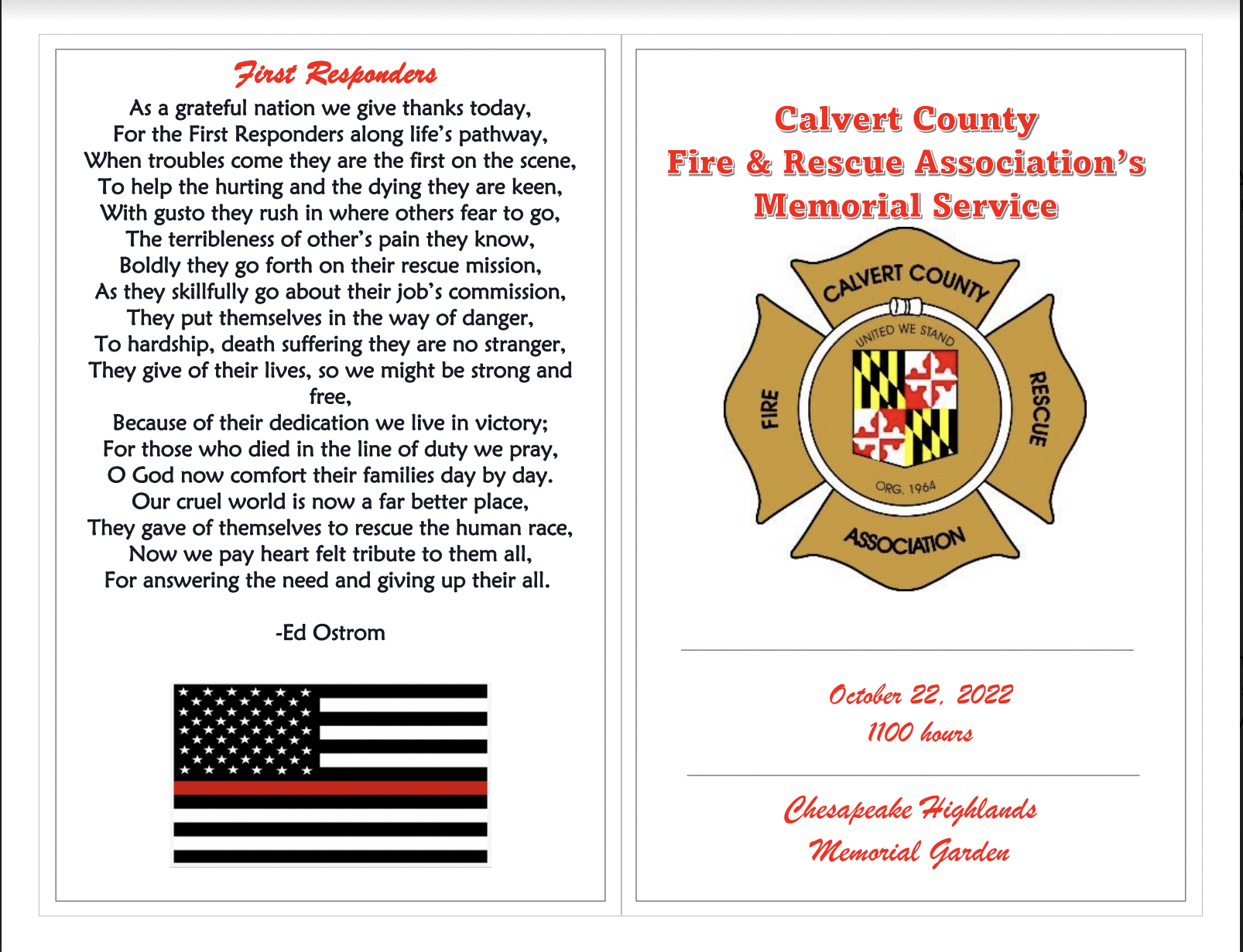 On October 22, 2022, The Calvert County Fire and Rescue honored fellow volunteers who passed away over the last year and those who have previously passed in the Line of Duty.