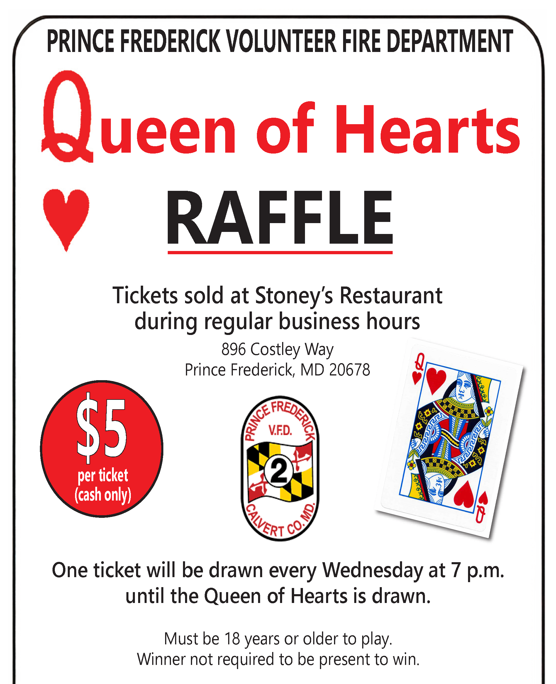 The Prince Frederick Volunteer Fire Department has partnered with Stoney’s of Prince Frederick to do a “Queen of Hearts Raffle” as a fundraiser for our department. The is a weekly
