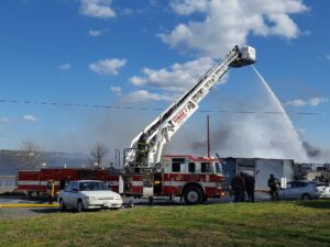 Units on the scene began a defensive attack (from the outside of the structure). A photo in this story shows Tower 2 handling this type of duty to put out the flames. Once the fire was knocked down, crews were able to enter inside and use ground hoses to put out hot spots. According to the fire marshal, high winds played a factor in the flames spreading so quickly.